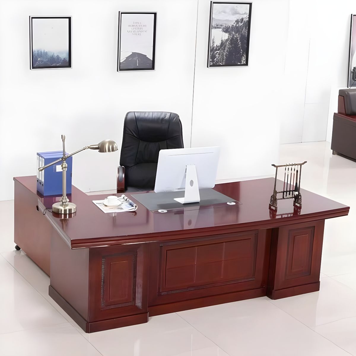 The ergonomic design of the desk ensures comfort during extended working hours, promoting productivity and focus. Its versatile design integrates seamlessly into various office décors, from contemporary to classic styles, making it a centerpiece for any executive office.