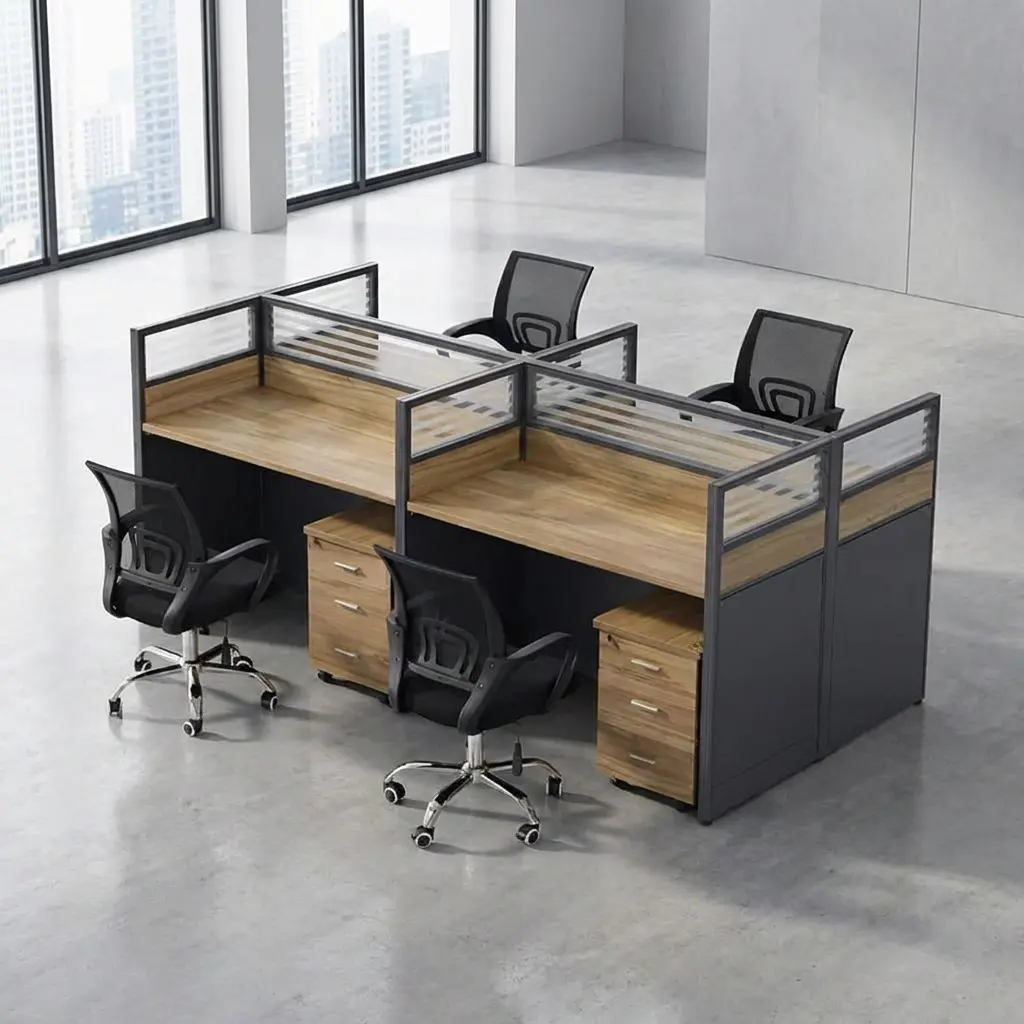 The 4-person workstation configuration provides individual workspaces for each user, ensuring privacy and focus while still encouraging collaboration. Its smart design helps maximize available floor space, making it perfect for both small and large office setups.
