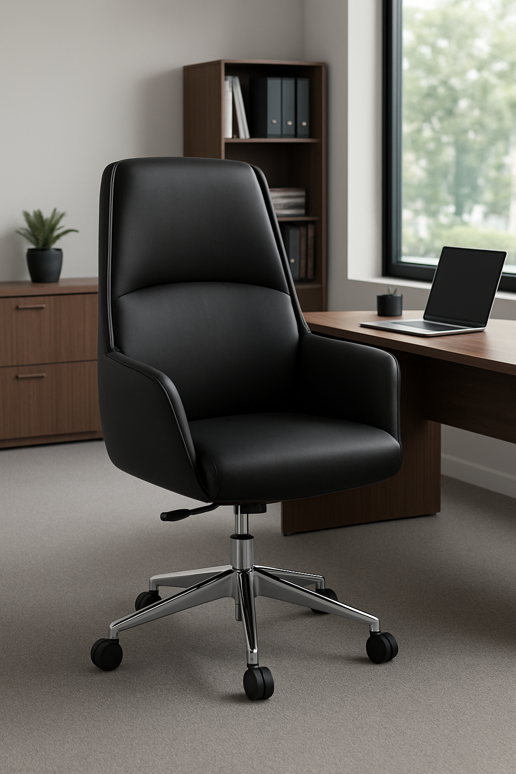The Executive Mid-Back Swivel Chair combines modern style with ergonomic comfort. Upholstered in premium leather, it features adjustable height, smooth 360° swivel, and padded support — perfect for professionals seeking elegance, mobility, and all-day comfort in the office.